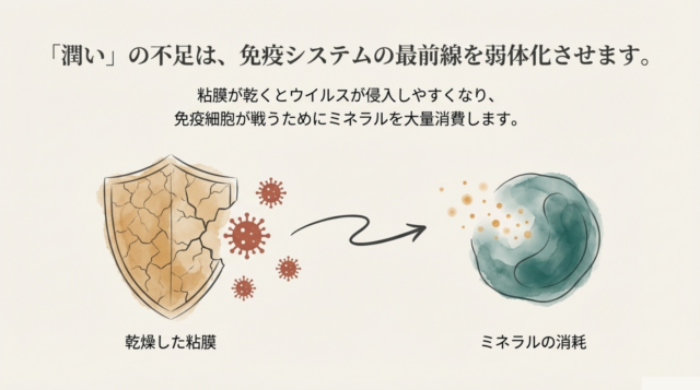 2. 粘膜の修復: 乾燥した空気から喉や鼻の粘膜を守り、修復するために「ミネラル」をはじめとする栄養素が大量に消費されます。