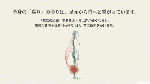 この「冷え → 心臓への負担 → ふくらはぎの硬化 → 首への張力」という流れは、一見すると無関係に見える体のパーツがいかに密接に連携しているかを示しています。