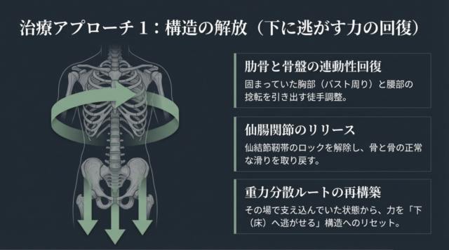 治療では「身体の中のゴミ掃除」を行いました。具体的には関節や筋肉の動きを良くしていきます。
