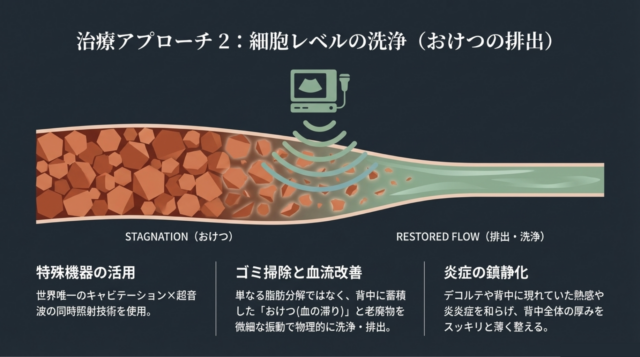 • 超音波による「ゴミ掃除」: 歯ブラシで届かない汚れを洗浄するように、超音波を使って体内のゴミを散らしていきます。