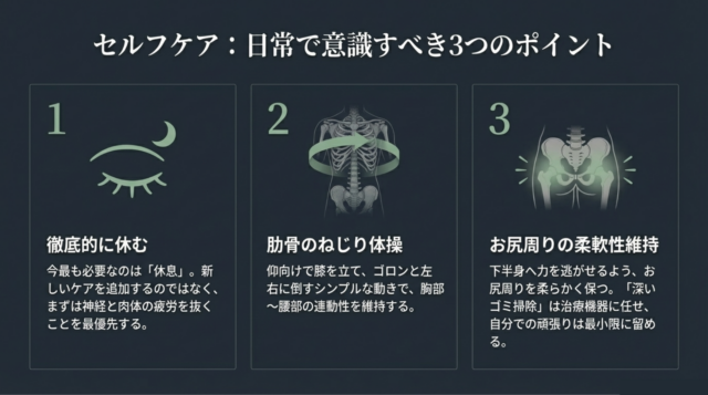 年度末や年度始めの忙しい時期だからこそ、自分自身の身体を整えることが必要です。これまでのケアで効果が出ない場合は、全体的な疲労が溜まっている可能性があります。