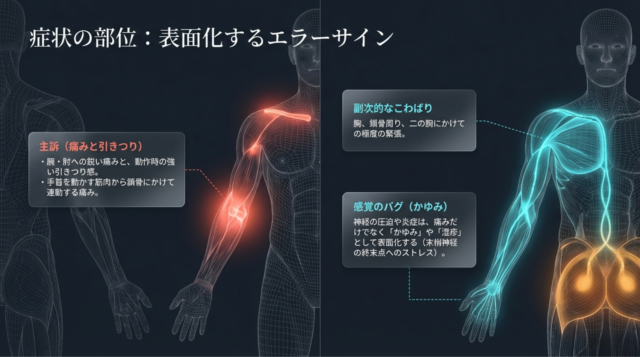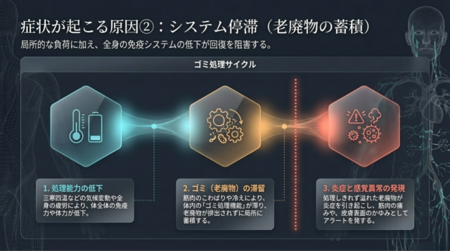 症状っていうのは、弱い組織や負担のかかる部位に出やすいんです。皮膚が弱いから皮膚に痒みとして出る。今の痛みの人は筋肉に負担がかかって筋肉が痛いとか、関節に負担をかけて関節が痛い。同じような発症なんだけども、負担のかかる部位が筋肉なのか、関節なのか、それとも皮膚なのかによって変わるんですよね。