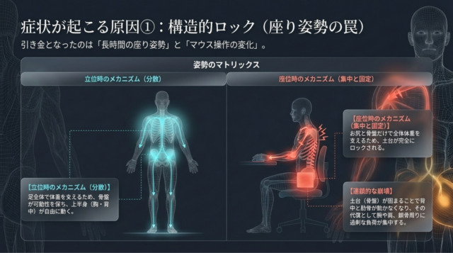 次に考えるのは、この肩の動きがなぜ固まってしまったかっていうところです。今回の症例の方では、デスクワークをすることが多いんです。そうすると、座るということ、立つということ、これの差を見るといいです。