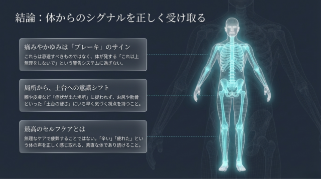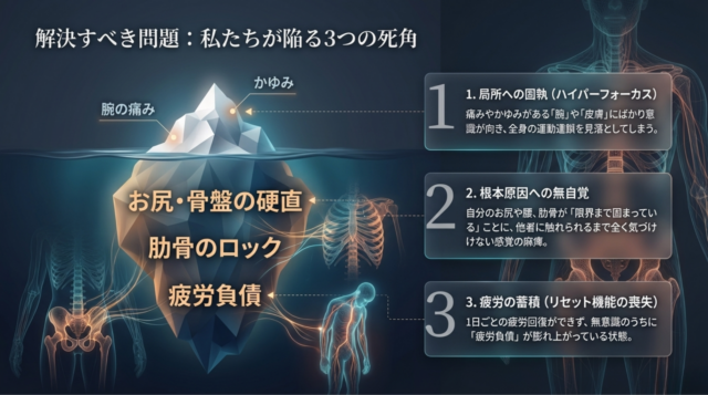 さて、いかがでしたでしょうか。意外な場所が痒みとか負担になってることにお気づきでしょうか。大事なのは、まず痛みや痒みっていうのが起きた時に、そこに負担がかかっている。その時何をしていたか、それを振り返るということが大事なんですね。