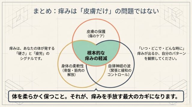 アトピーの痒みは、皮膚だけの問題ではなく、姿勢・神経・自律神経・消化機能・生活環境など、さまざまな要因が複合しています。[4]「いつ・どこで・どんな時に痒くなるか」を丁寧に観察することが、自分に合ったケアへの第一歩です。
