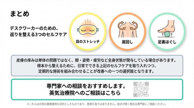 皮膚の痒みは皮膚だけの問題ではなく、眼・姿勢・疲労といった身体全体の状態が関与している場合があります。セルフケアと定期的な施術を組み合わせて、根本からアプローチしていくことが一つの選択肢となる可能性があります。専門家への相談をおすすめします。