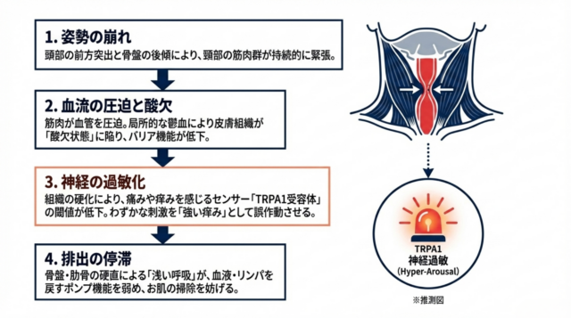 頭部が前方に突出した姿勢や骨盤の後傾は、頸部の筋肉群を持続的に緊張させ、血管を物理的に圧迫します。この局所的な鬱血(血液の停滞)は、皮膚組織への酸素供給を妨げ、バリア機能の低下を招く一因と考えられます。